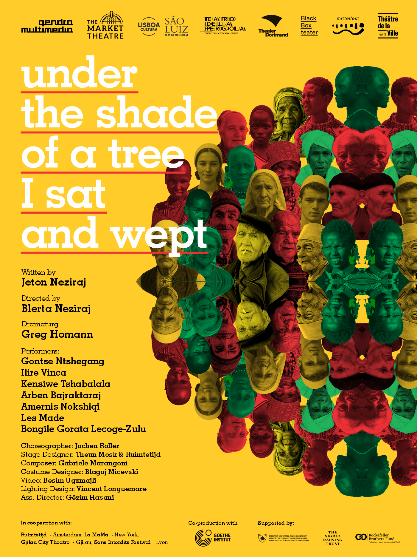 Author: Jeton Neziraj | Directed by: Blerta Neziraj | Dramaturg: Greg Homann | Performers: Ema Andrea, Gontse Ntshegang, Ilire Vinca, Kensiwe Tshabalala, Arben Bajraktaraj, Les Made | Composer: Bongile Gorata Lecoge-Zulu | Stage Designer: Theun Mosk | Ruimtetijd | Choreographer: Jochen Roller | Costume Designer: Blagoj Micevski | Video: Besim Ugzmajli | Lighting Design: Vincent Longuemare | Ass. Director: Gezim Hasani | Art Director: Aurela Kadriu | Associate Stage Designer: Rients Dijkstra | Technical Director: Bekim Korça |PR: Natasha Tripney | Artistic Advisers: Agron Demi, Julia Wissert, Tom Mustroph, Catherine Kennedy, Riza Krasniqi | Fundraising Support: Sven Skoric | Lights: Mursel Bekteshi | Sound: Bujar Bekteshi | Coordination: Flaka Rrustemi | Promotion: Florida Kastrati| Wardrobe Attendant: Arbresha Caka.